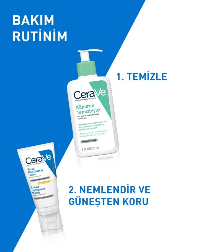 Nemlendirici bir yüz kremi,herhangi bir sabah cilt bakımı rutininin önemli bir parçasıdır ve geniş spektrumlu SPF’ye sahip bir nemlendirici,cildinizin zararlı UVA ve UVB ışınlarından korunmasına yardımcı olmak açısından kritik öneme sahiptir.Bir yüz nemlendiricinde nemlendirme etkisinin yanısıra E vitamini,niasinamid ve seramidler gibi bileşenler ile cilt bariyerini onarmaya yardımcı olan,komodejonik olmayan ve güneş ışınlarına karşı koruma sağlayan bir formül arayın. CeraVe Yüz Kremi SPF 50,3 temel seramid, E vitamini ve niasinamidin yanı sıra gün boyunca çok ihtiyaç duyulan nemi sağlamak için MVE Teknolojimizi içeren çok amaçlı bir sabah cilt bakımı ürünüdür.Geniş Spektrumlu güneş koruyucu sunan SPF 50 nemlendiricimiz,hafif dokulu formülü ile kolayca emilir.Parfüm içermeyen formülü hassas ciltlere uygundur.