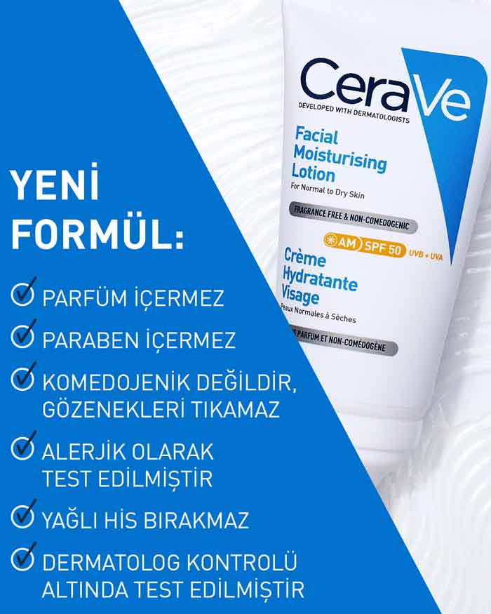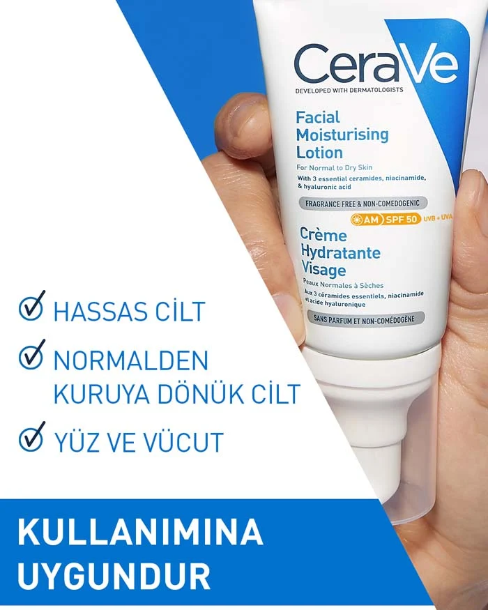 CeraVe Yüz Kremi SPF 50,3 temel seramid, E vitamini ve niasinamidin yanı sıra gün boyunca çok ihtiyaç duyulan nemi sağlamak için MVE Teknolojimizi içeren çok amaçlı bir sabah cilt bakımı ürünüdür.